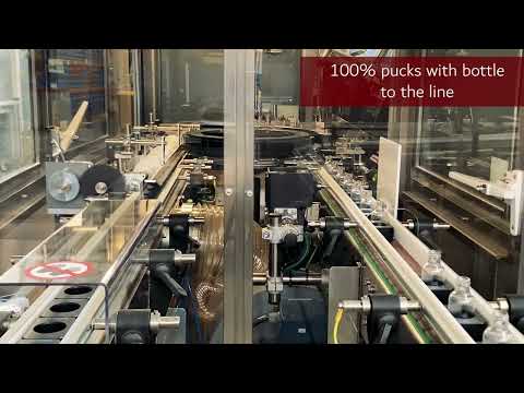 I pucks entrano vuoti dalla fine della linea e tutti escono dal posizionatore con una bottiglia all'interno. Nessun puck viene inviato alla linea di riempimento senza bottiglia.